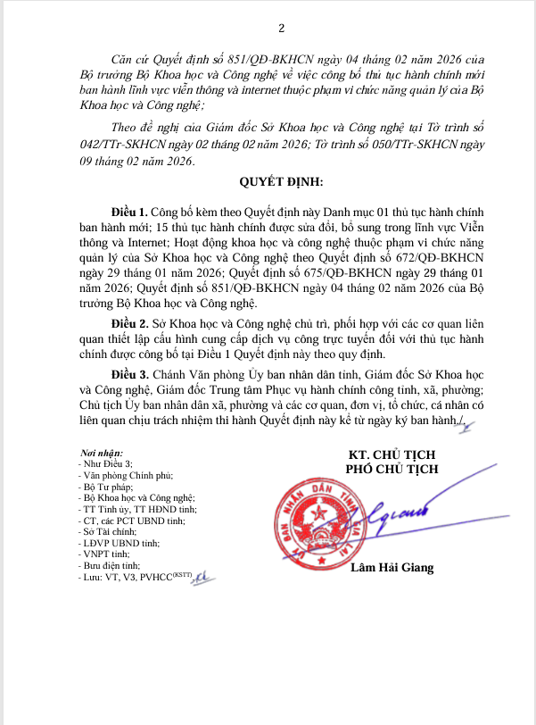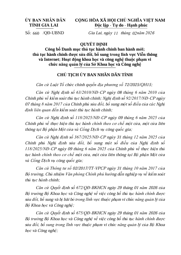 Thứ sáu, 13/02/2026 | 09:54 A- A A+ | QUYẾT ĐỊNH Công bố Danh mục thủ tục hành chính ban hành mới; thủ tục hành chính được sửa đổi, bổ sung trong lĩnh vực Viễn thông và Internet; Hoạt động khoa học và công nghệ thuộc phạm vi chức năng quản lý của Sở Khoa học và Công nghệ Chia sẻ Đọc bài Lưu 660_QĐ-UBND_11022026-signed_01.pdf