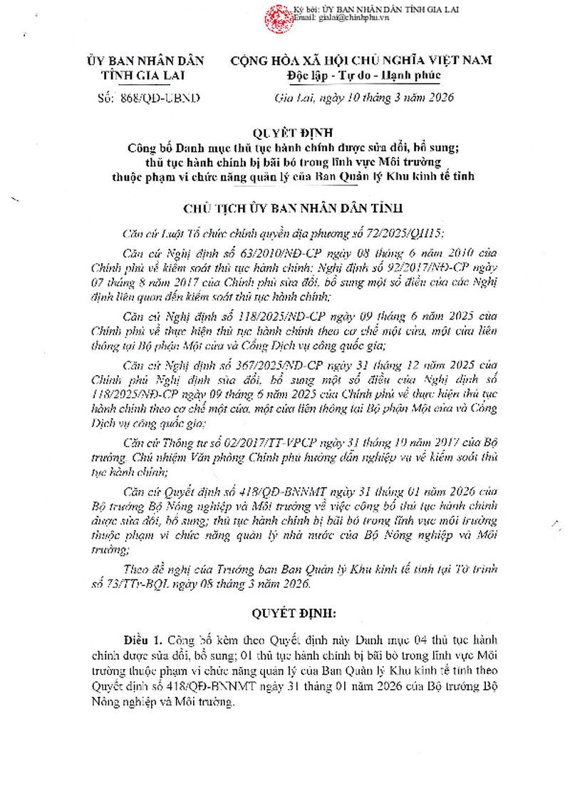 | Tiêu đề văn bản | Thông báo công khai Danh mục thủ tục hành chính được sửa đổi, bổ sung; thủ tục hành chính bị bãi bỏ trong lĩnh vực Môi trường thuộc chức năng Ban quản lý khu kinh tế tỉnh | ||