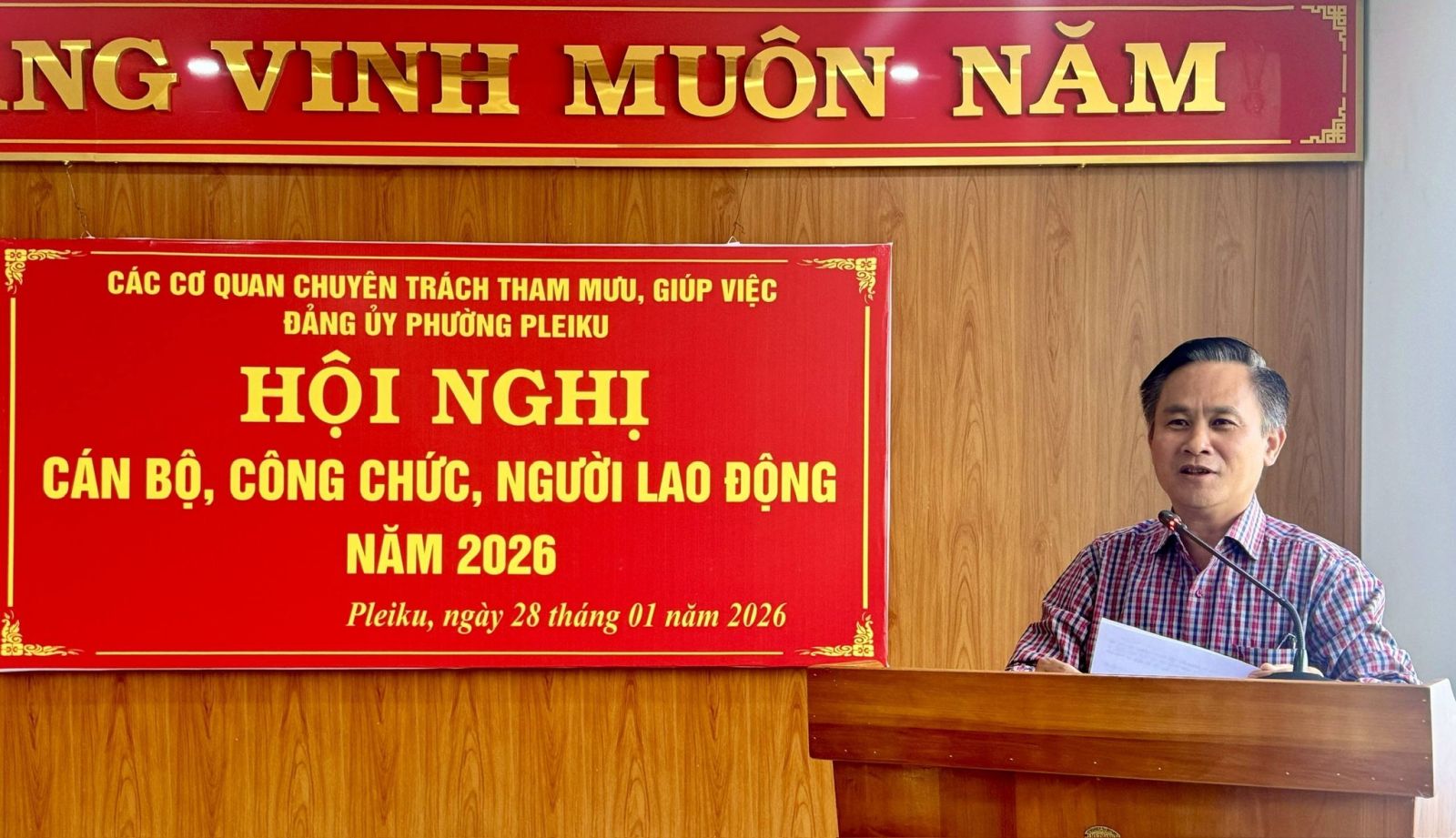 Chiều ngày 28/1/1026, các cơ quan chuyên trách tham mưu giúp việc Đảng ủy phường Pleiku đã tổ chức Hội nghị cán bộ, công chức, người lao động nhằm tổng kết đánh giá thực hiện nhiệm vụ năm 2025 và thảo luận, thống nhất phương hướng, nhiệm vụ trọng tâm năm 2026. Đồng chí Nguyễn Xuân Phước – Tỉnh ủy viên - Bí thư Đảng ủy - Chủ tịch HĐND phường Pleiku dự, chỉ đạo hội nghị.