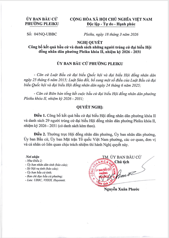 Thứ năm, 19/03/2026 | 09:06 A- A A+ | Công bố kết quả bầu cử và danh sách những người trúng cử đại biểu Hội đồng nhân dân phường Pleiku khóa II, nhiệm kỳ 2026 - 2031 Chia sẻ Đọc bài Lưu