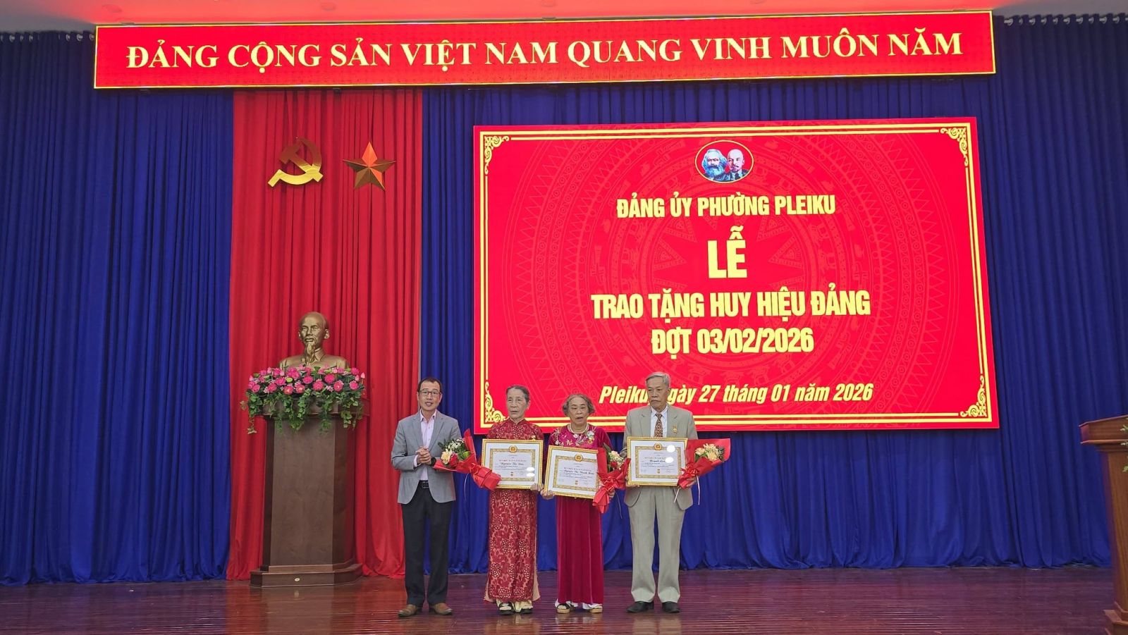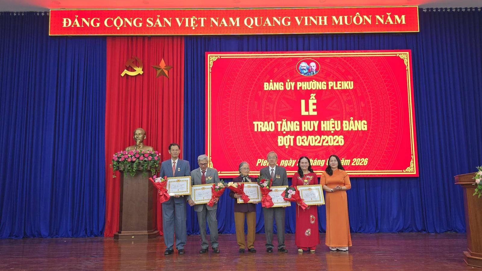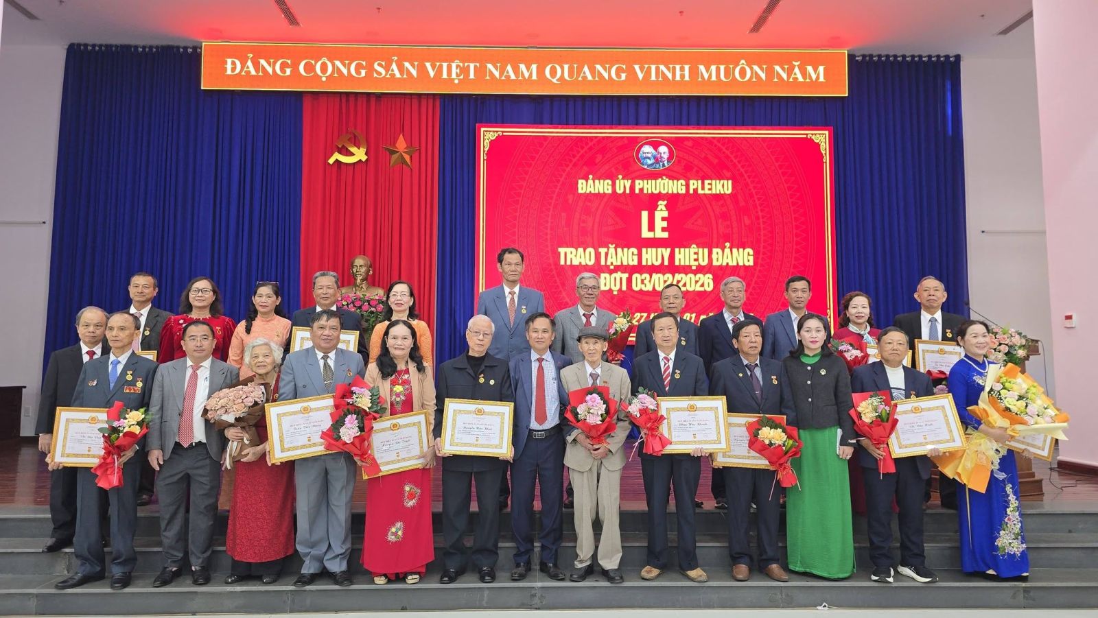 Buổi lễ được tổ chức trang trọng, đúng quy định. Đối với các đảng viên tuổi cao, sức khỏe yếu không thể tham dự, Đảng ủy phường Pleiku sẽ tổ chức trao tặng Huy hiệu Đảng tại nhà theo kế hoạch.