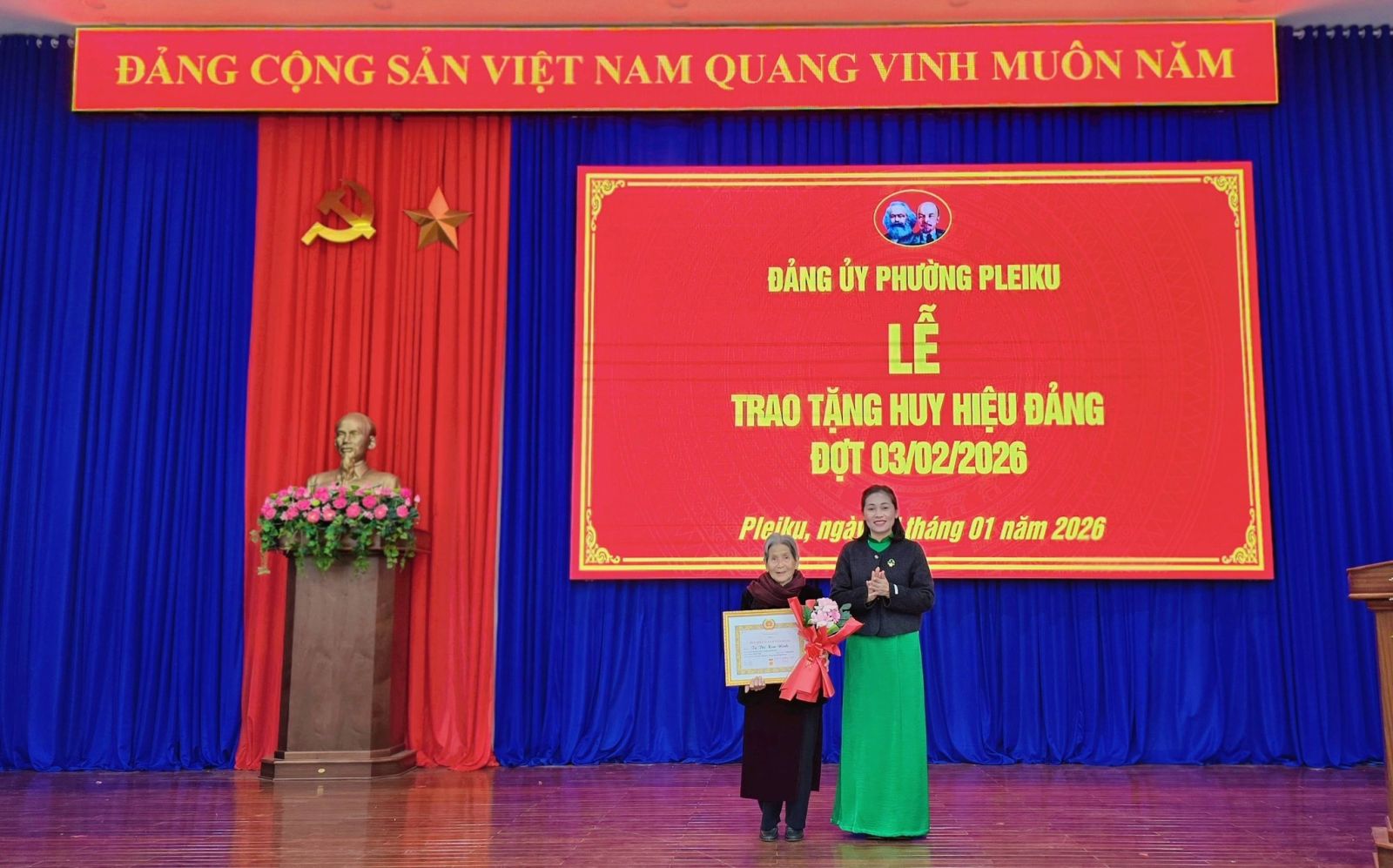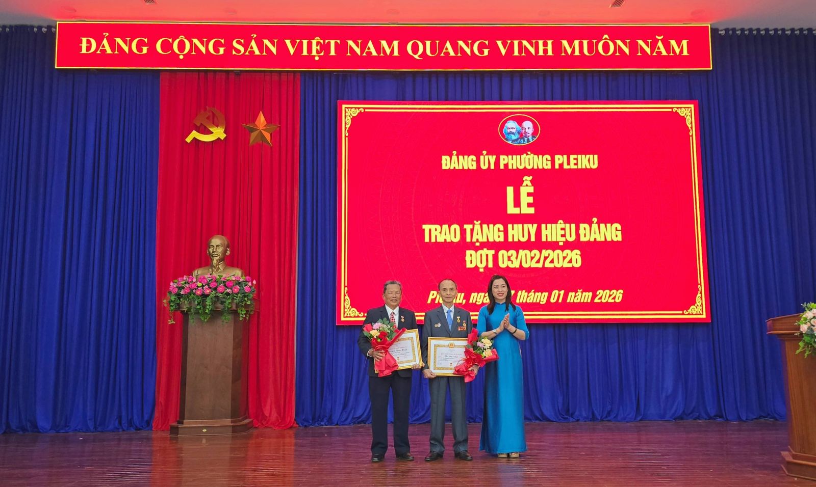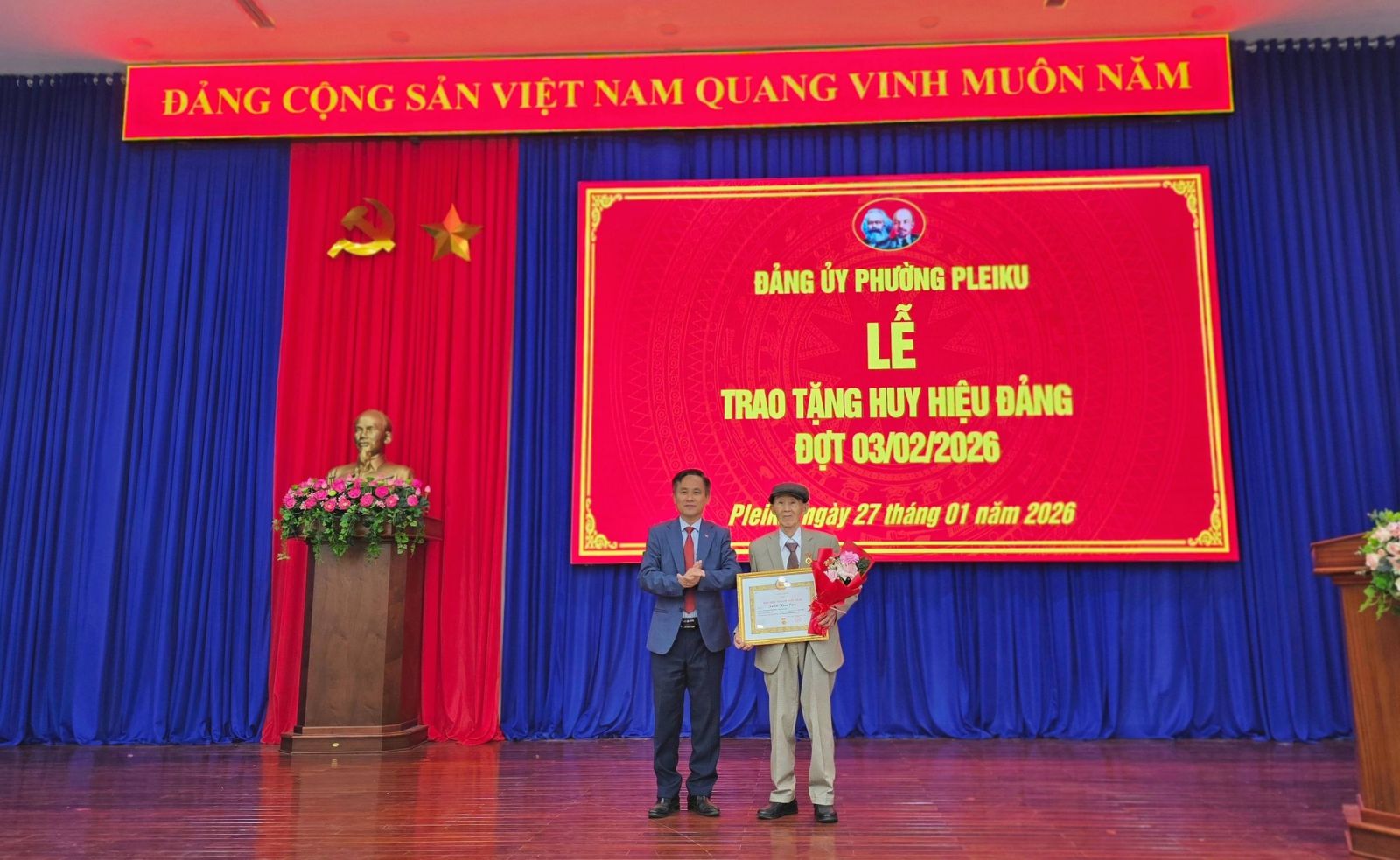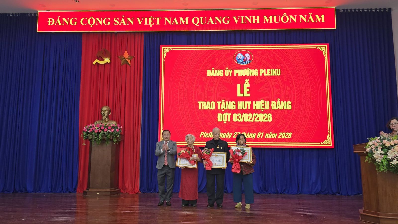 Buổi lễ được tổ chức trang trọng, đúng quy định. Đối với các đảng viên tuổi cao, sức khỏe yếu không thể tham dự, Đảng ủy phường Pleiku sẽ tổ chức trao tặng Huy hiệu Đảng tại nhà theo kế hoạch.