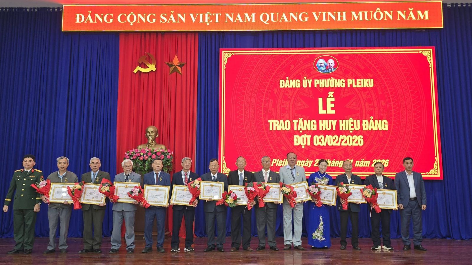 Tại buổi lễ, Ban Thường vụ Đảng ủy phường Pleiku đã công bố Quyết định số 221-QĐ/TU, ngày 12-1-2026 của Ban Thường vụ Tỉnh ủy Gia Lai về việc trao tặng Huy hiệu Đảng cho 45 đảng viên. Trong đó, có 1 đảng viên được trao Huy hiệu 70 năm tuổi Đảng; 1 đảng viên Huy hiệu 65 năm; 3 đảng viên Huy hiệu 60 năm; 3 đảng viên Huy hiệu 55 năm; 3 đảng viên Huy hiệu 50 năm; 5 đảng viên Huy hiệu 45 năm; 12 đảng viên Huy hiệu 40 năm và 17 đảng viên Huy hiệu 30 năm tuổi Đảng.