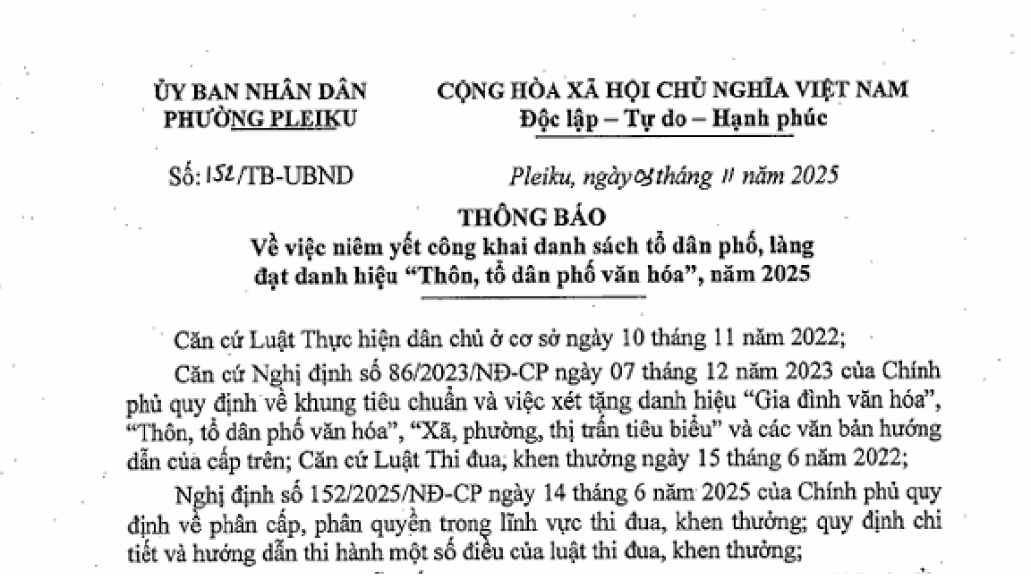 Việc niêm yết được thực hiện căn cứ theo kết quả cuộc họp của Hội đồng Thi đua, khen thưởng phường Pleiku ngày 03/11/2025 về việc xét, đề nghị công nhận danh hiệu “Tổ dân phố văn hóa” năm 2025.