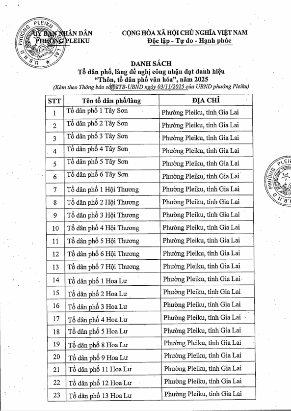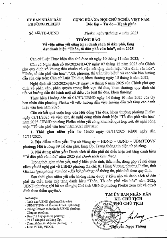 Ủy ban nhân dân phường Pleiku trân trọng thông báo về việc niêm yết công khai danh sách các tổ dân phố, làng đủ điều kiện xét tặng danh hiệu “Tổ dân phố văn hóa” năm 2025.