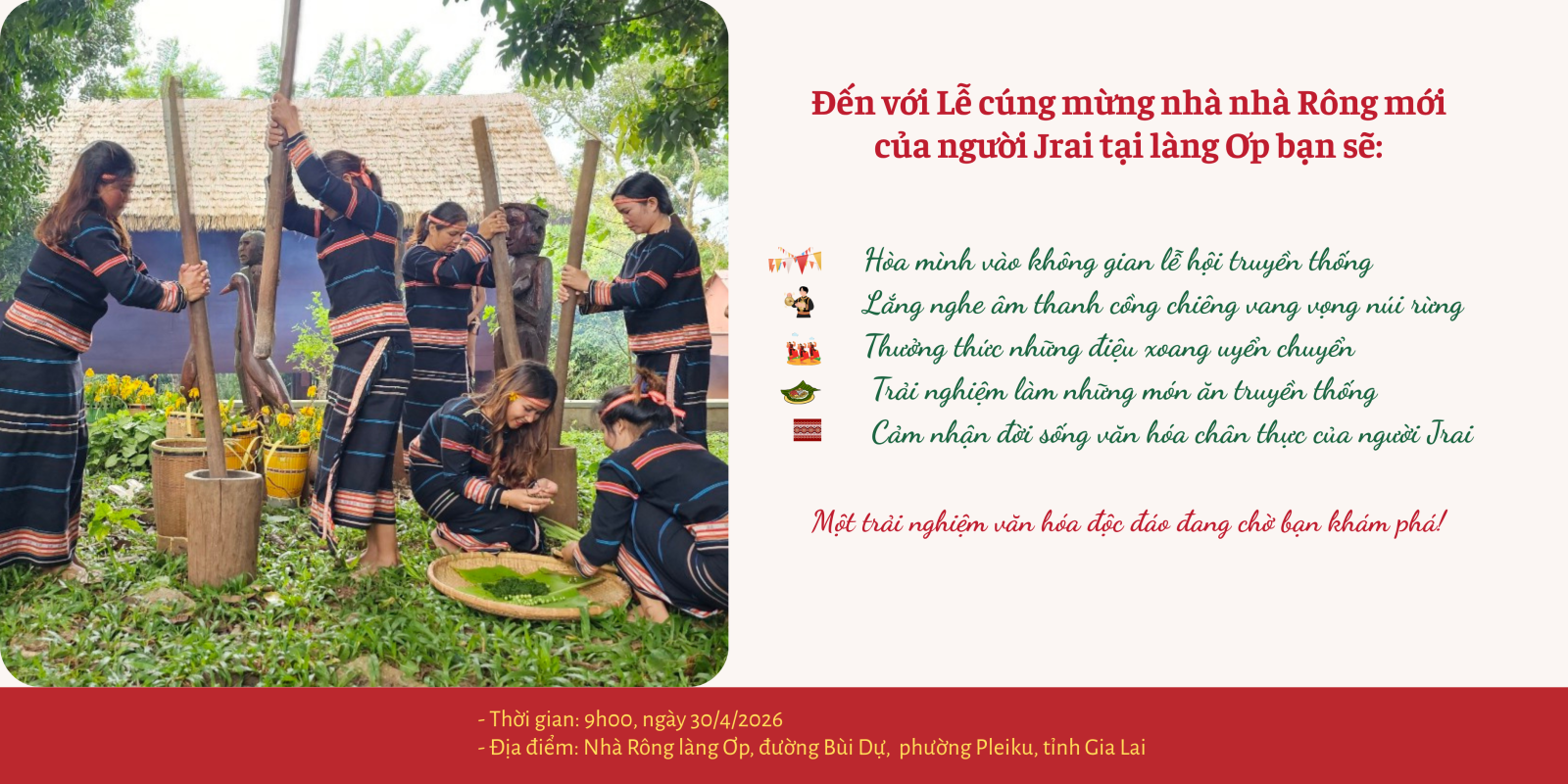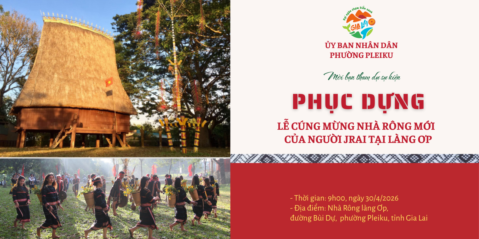 Nhằm bảo tồn và phát huy các giá trị văn hóa truyền thống của đồng bào dân tộc Jrai tại làng Ơp, đồng thời từng bước xây dựng mô hình du lịch cộng đồng gắn với trải nghiệm văn hóa bản địa, Ủy ban nhân dân phường Pleiku trân trọng thông báo việc tổ chức sự kiện Phục dựng Lễ cúng mừng nhà Rông mới của người Jrai tại làng Ơp với các nội dung cụ thể như sau: