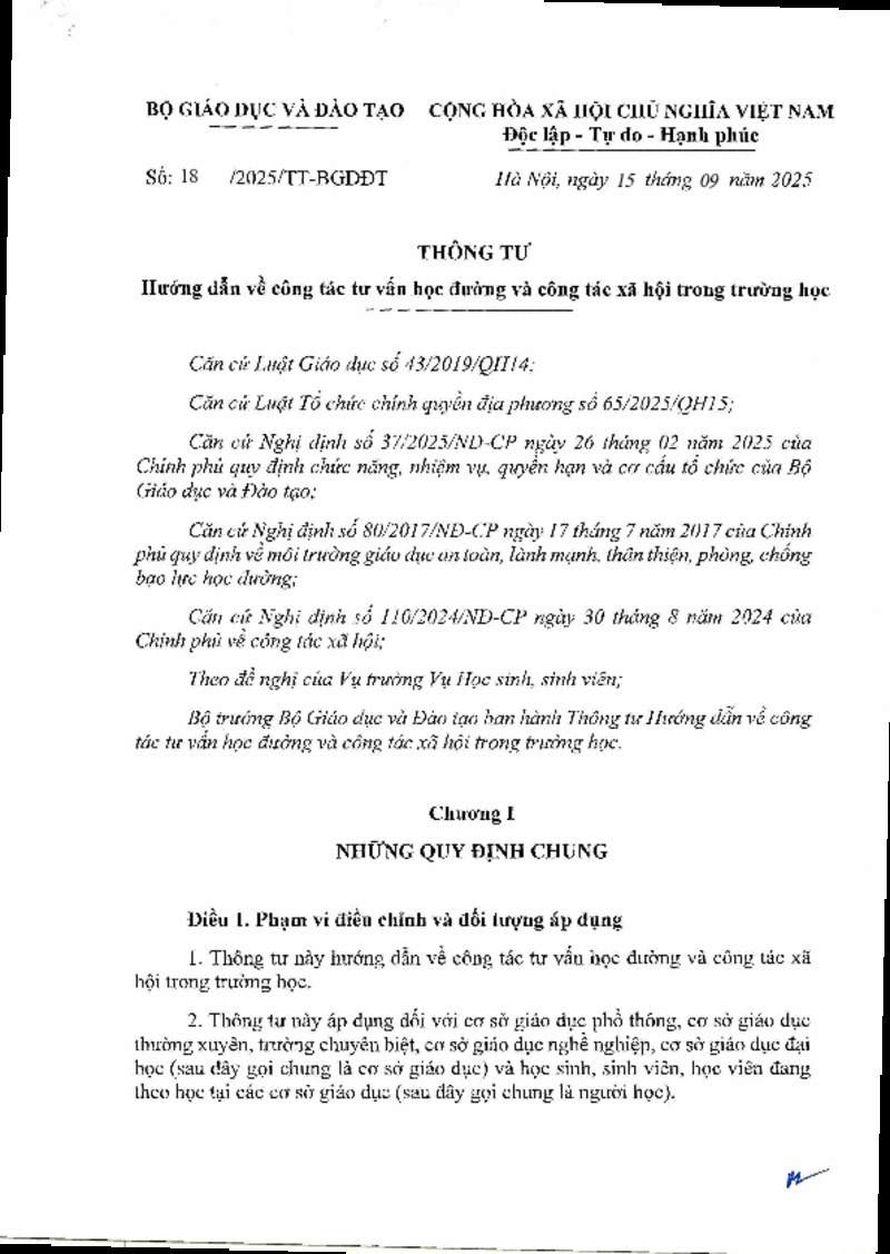 Tiêu đề văn bản | Thông tư Hướng dẫn về công tác tư vấn học đường và công tác xã hội trong trường học | ||