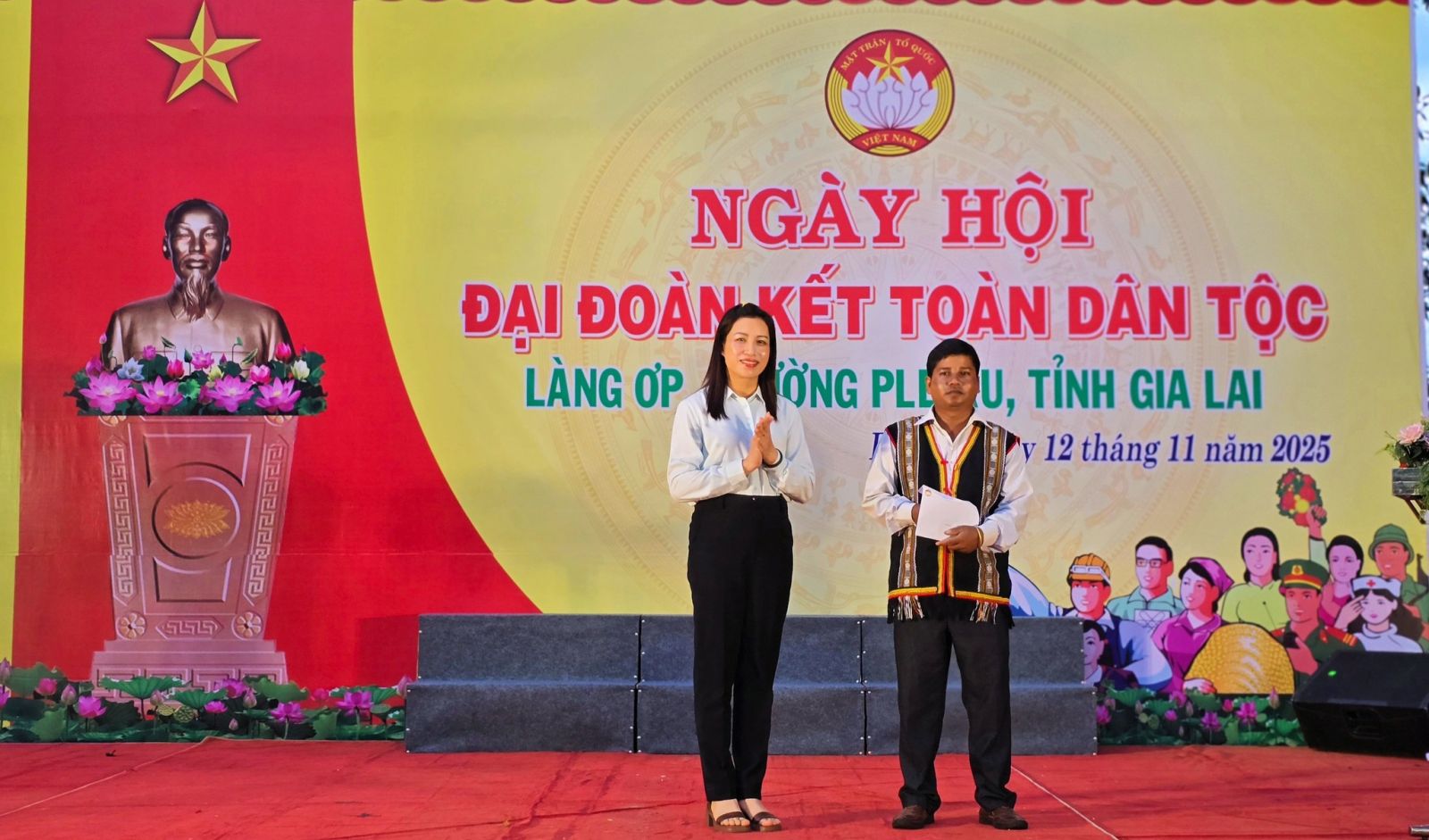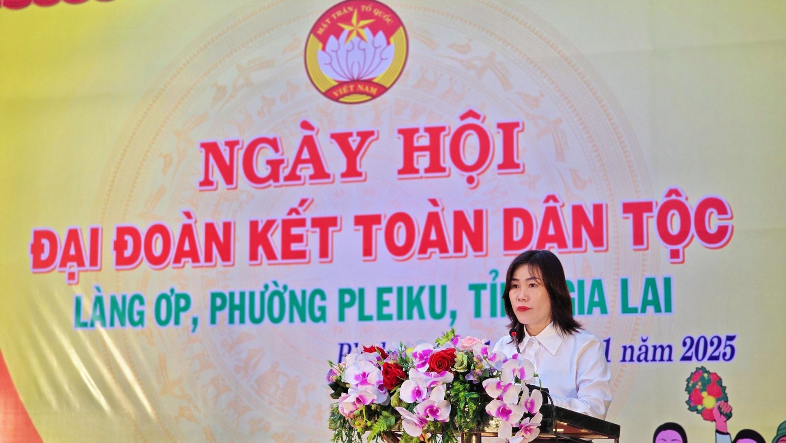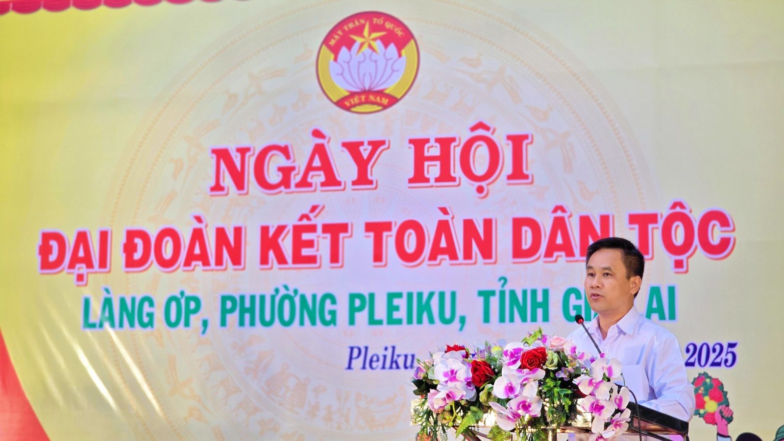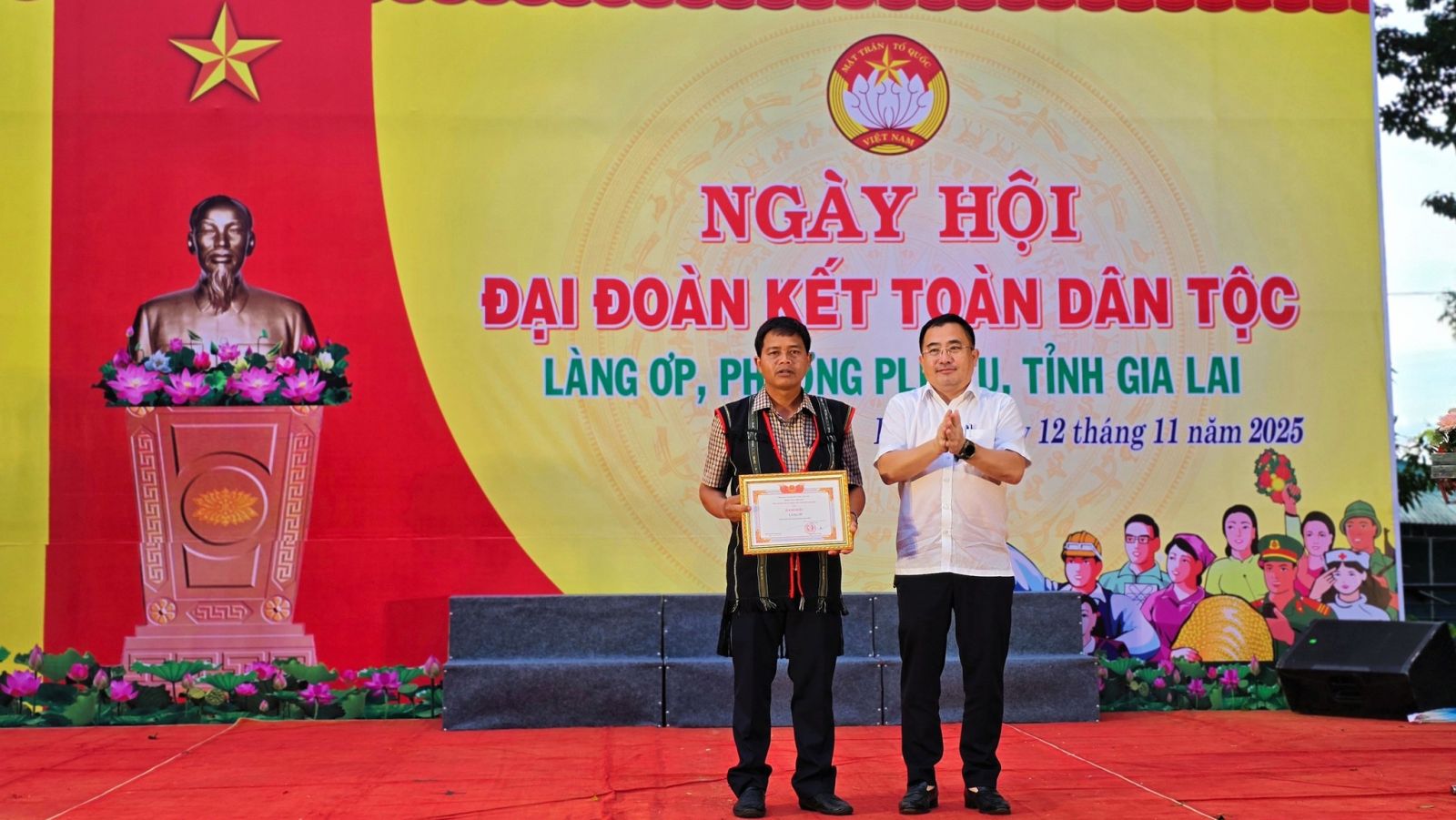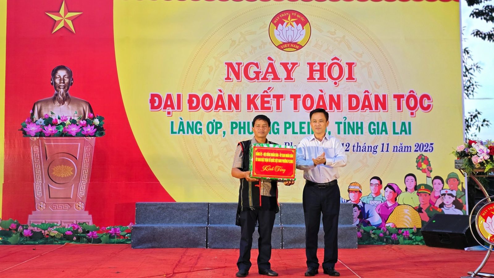 Tại Ngày hội, ông Đặng Toàn Thắng-Chủ tịch UBND phường Pleiku đã trao danh hiệu “Làng văn hóa năm 2025” cho làng Ơp. Ban công tác Mặt trận làng cũng phát động phong trào thi đua chào mừng Đại hội đại biểu Mặt trận Tổ quốc Việt Nam các cấp.