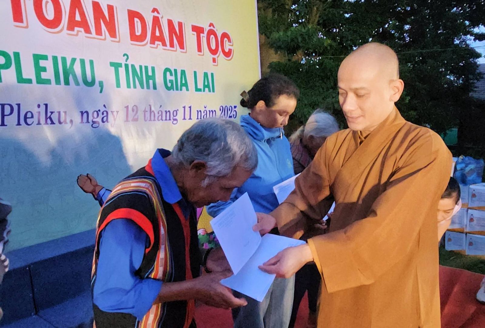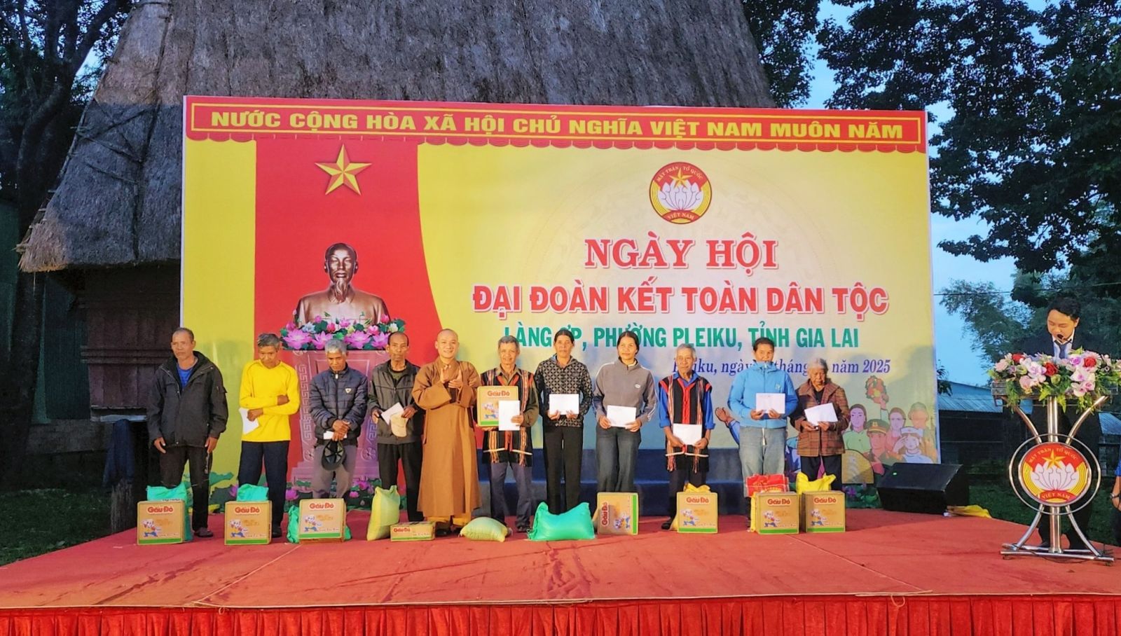 Nhân dịp này, Bí thư Đảng ủy phường Nguyễn Xuân Phước thay mặt Đảng ủy, HĐND, UBND, Ủy ban MTTQ Việt Nam phường Pleiku tặng quà cho bà con nhân dân làng Ơp. Trụ trì chùa Vạn Phật và Công ty TNHH Hoàng Minh cũng trao tặng 20 suất quà cho các hộ có hoàn cảnh khó khăn trên địa bàn phường.