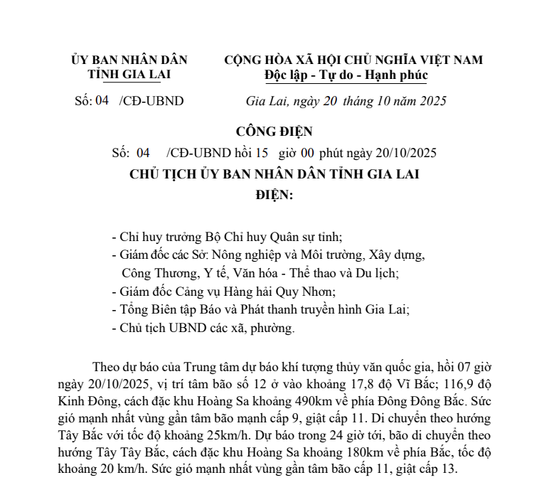 Để chủ động ứng phó, Chủ tịch UBND tỉnh Gia Lai yêu cầu Chỉ huy trưởng Bộ Chỉ huy Quân sự tỉnh; Giám đốc các Sở: Nông nghiệp và Môi trường, Xây dựng, Công Thương, Y tế, Văn hóa - Thể thao và Du lịch; Giám đốc Cảng vụ Hàng hải Quy Nhơn; Tổng Biên tập Báo và Phát thanh truyền hình Gia Lai; Chủ tịch UBND các xã, phường khẩn trương triển khai các nội dung sau: