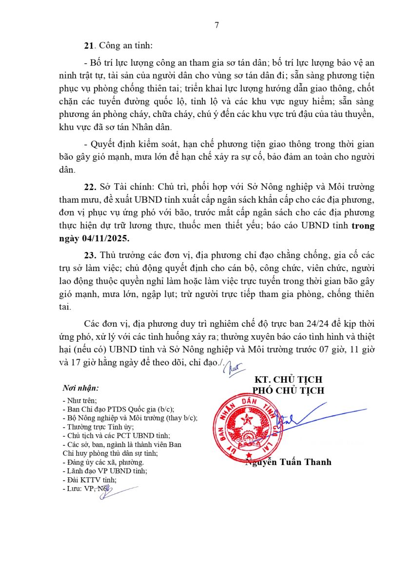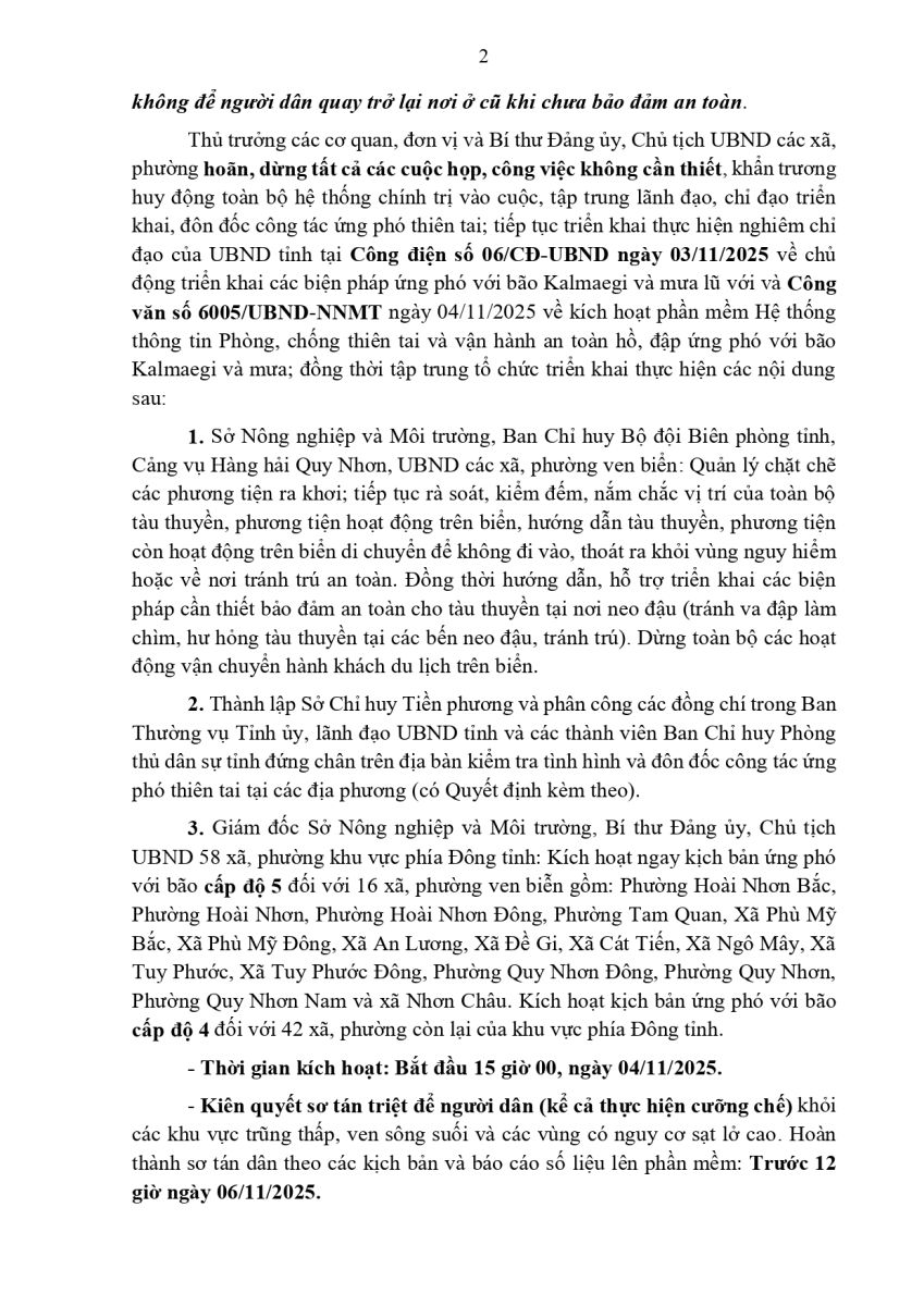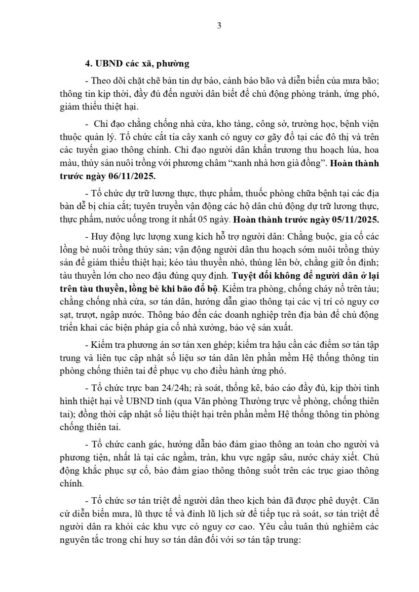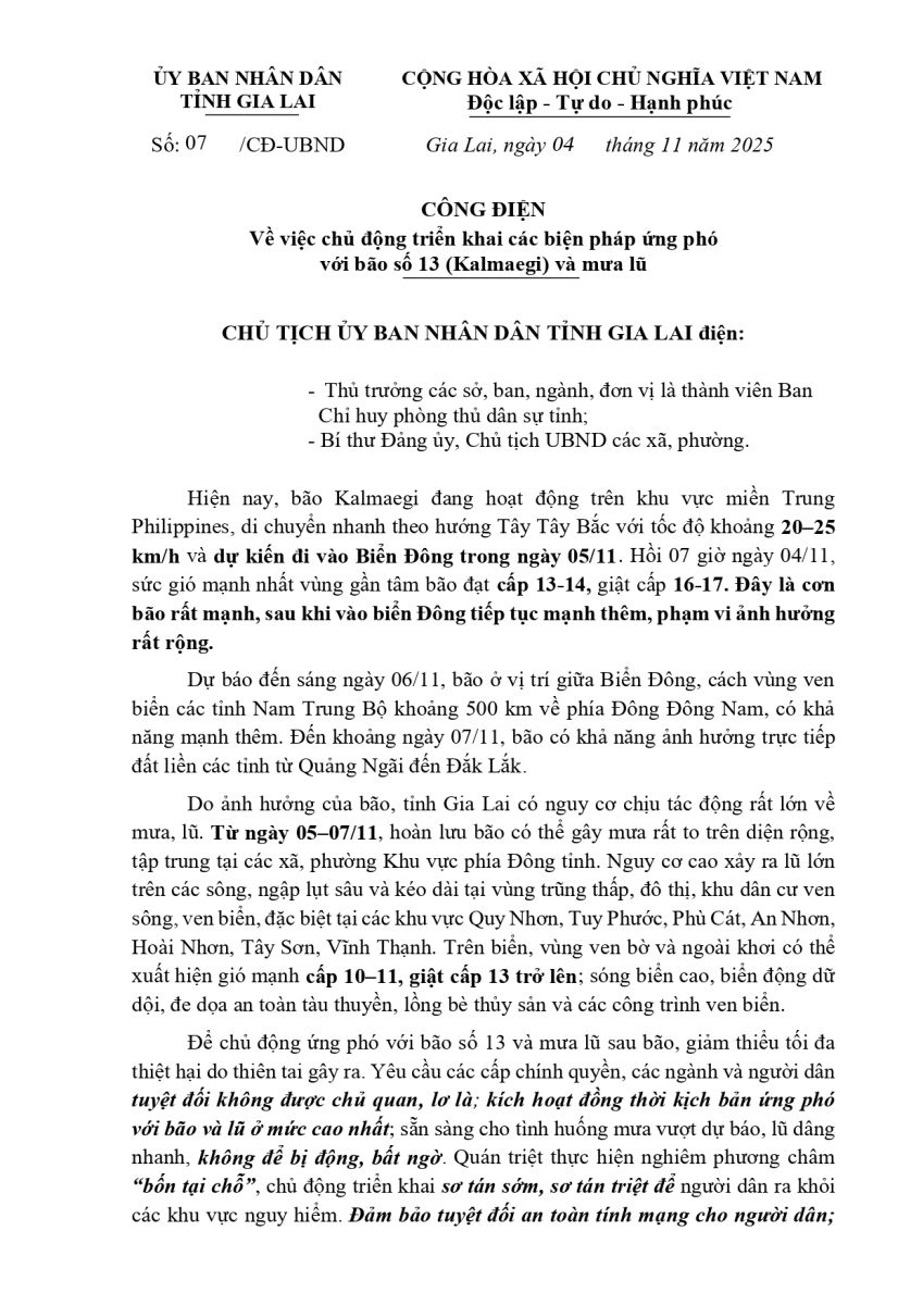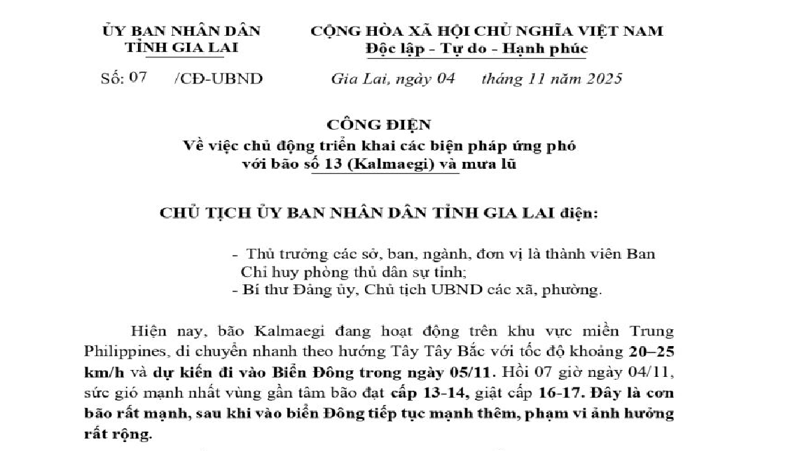 Thứ tư, 05/11/2025 | 14:07 A- A A+ | Công điện số 07/CĐ-UBND ngày 04/11/2025 của Chủ tịch UBND tỉnh về việc chủ động triển khai các biện pháp ứng phó với bão số 13 (Kalmaegi) và mưa lũ Chia sẻ Đọc bài Lưu