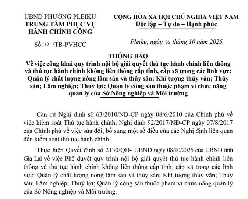 Việc công khai được thực hiện theo Quyết định số 2130/QĐ-UBND ngày 08/10/2025 của UBND tỉnh Gia Lai về việc phê duyệt quy trình nội bộ giải quyết TTHC liên thông và không liên thông cấp tỉnh, cấp xã.