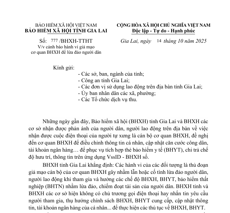 Bảo hiểm xã hội (BHXH) tỉnh Gia Lai ra thông báo cảnh báo về hành vi giả mạo cán bộ BHXH để lừa đảo người dân và người lao động trên địa bàn.