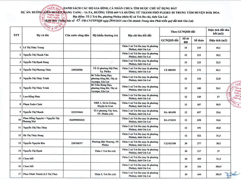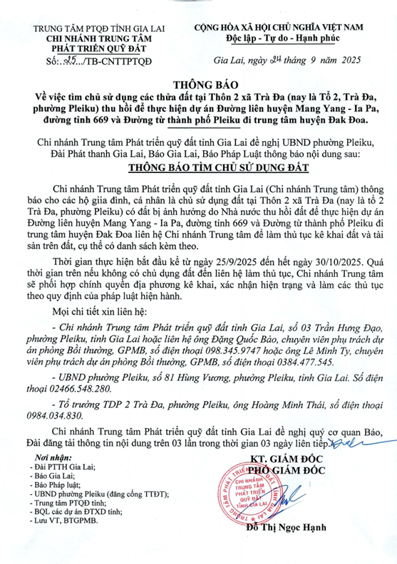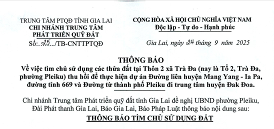 Thứ hai, 29/09/2025 | 07:53 A- A A+ | THÔNG BÁO Chia sẻ Đọc bài Lưu Về việc tìm chủ sử dụng các thửa đất tại Thôn 2 xã Trà Đa (nay là Tổ 2, Trà Đa, phường Pleiku) thu hồi để thực hiện dự án Đường liên huyện Mang Yang - Ia Pa, đường tỉnh 669 và Đường từ thành phố Pleiku đi trung tâm huyện Đak Đoa