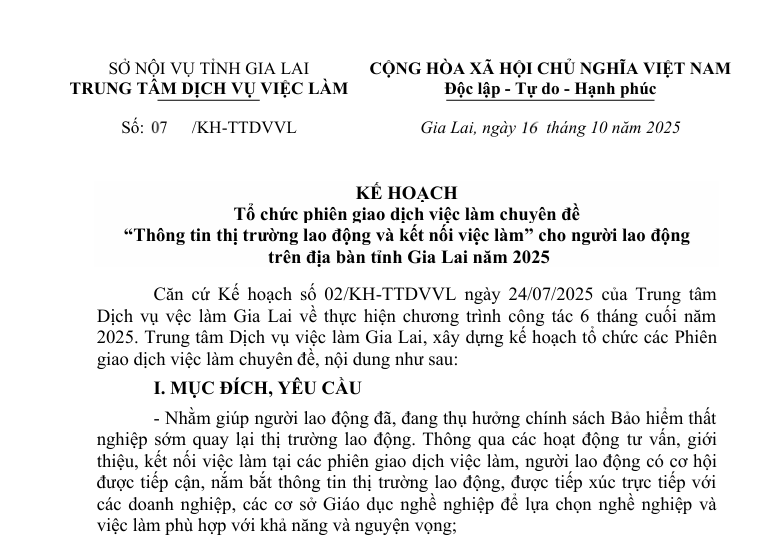 Nhằm hỗ trợ người lao động, đặc biệt là những người đang hưởng chính sách bảo hiểm thất nghiệp, nhanh chóng quay trở lại thị trường lao động, Trung tâm Dịch vụ việc làm Gia Lai sẽ tổ chức chuỗi phiên giao dịch việc làm chuyên đề trong tháng 10 năm 2025.