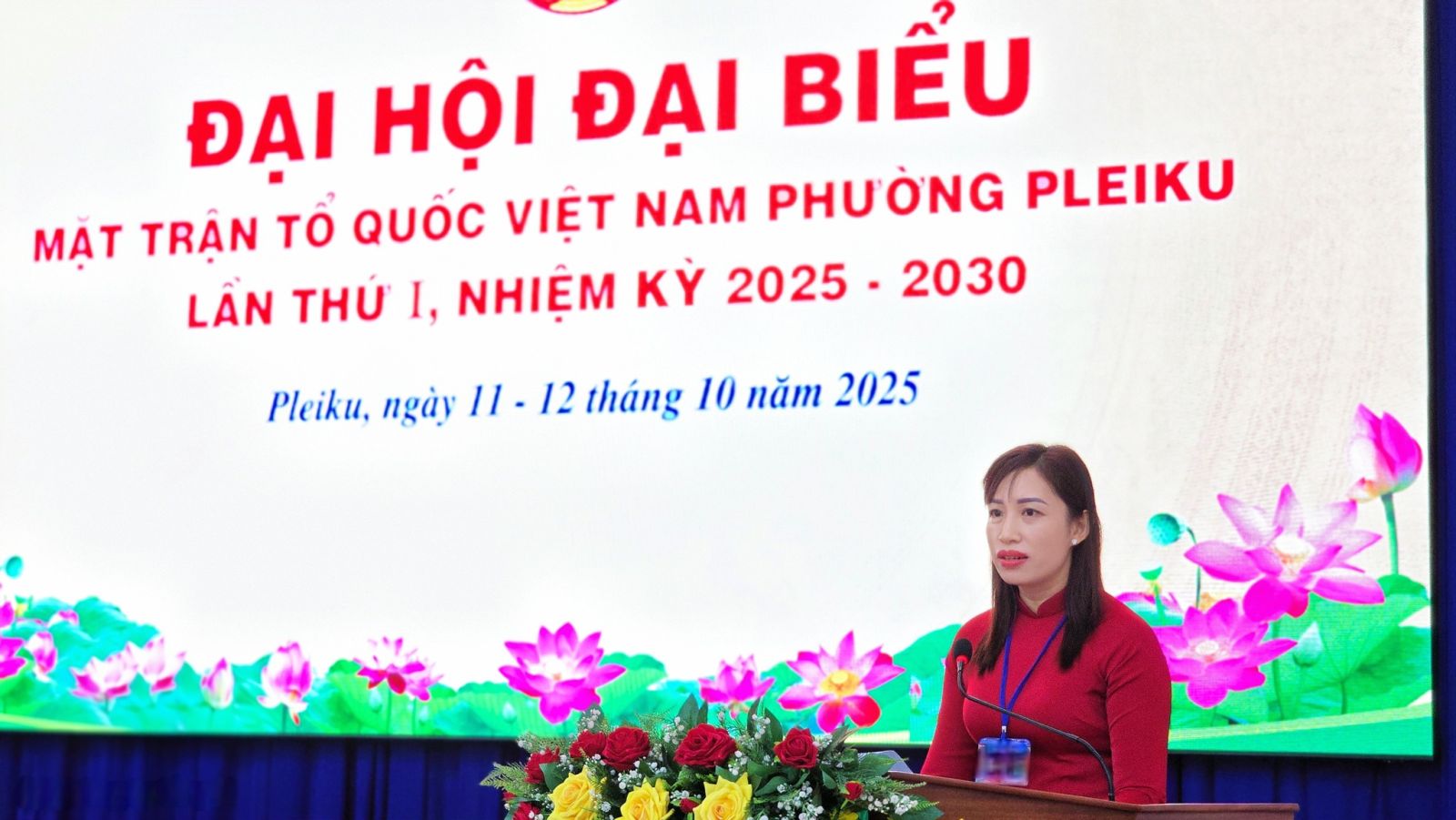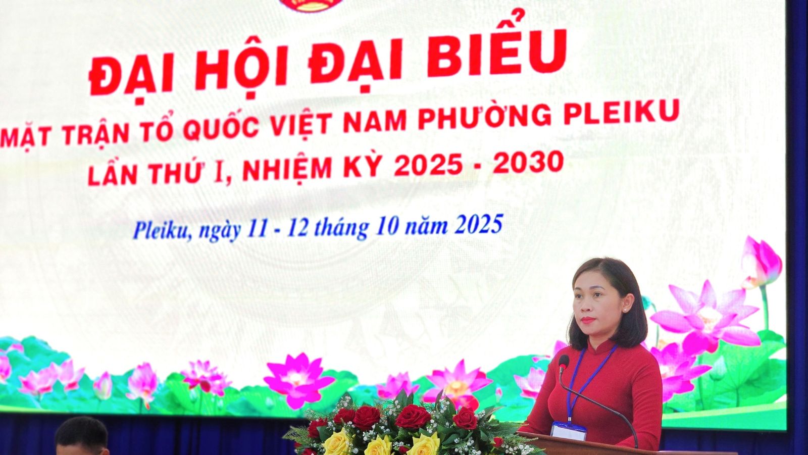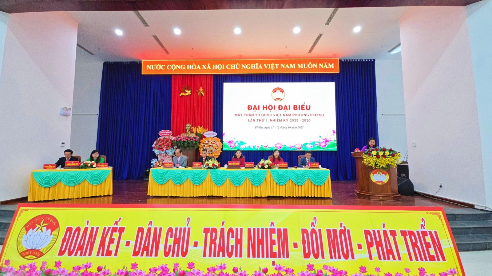 Trong 2 ngày 11 và 12-10, Ủy ban MTTQ Việt Nam phường Pleiku (tỉnh Gia Lai) tổ chức Đại hội đại biểu lần thứ I, nhiệm kỳ 2025-2030. Dự và chỉ đạo Đại hội có bà Hà Thị Giang Thảo-Tỉnh ủy viên, Phó Chủ tịch Ủy ban MTTQ Việt Nam tỉnh, Chủ tịch Hội Liên hiệp Phụ nữ tỉnh; ông Nguyễn Xuân Phước-Tỉnh ủy viên, Bí thư Đảng ủy, Chủ tịch HĐND phường Pleiku cùng 118 đại biểu đại diện cho các tầng lớp nhân dân, dân tộc, tôn giáo trên địa bàn.