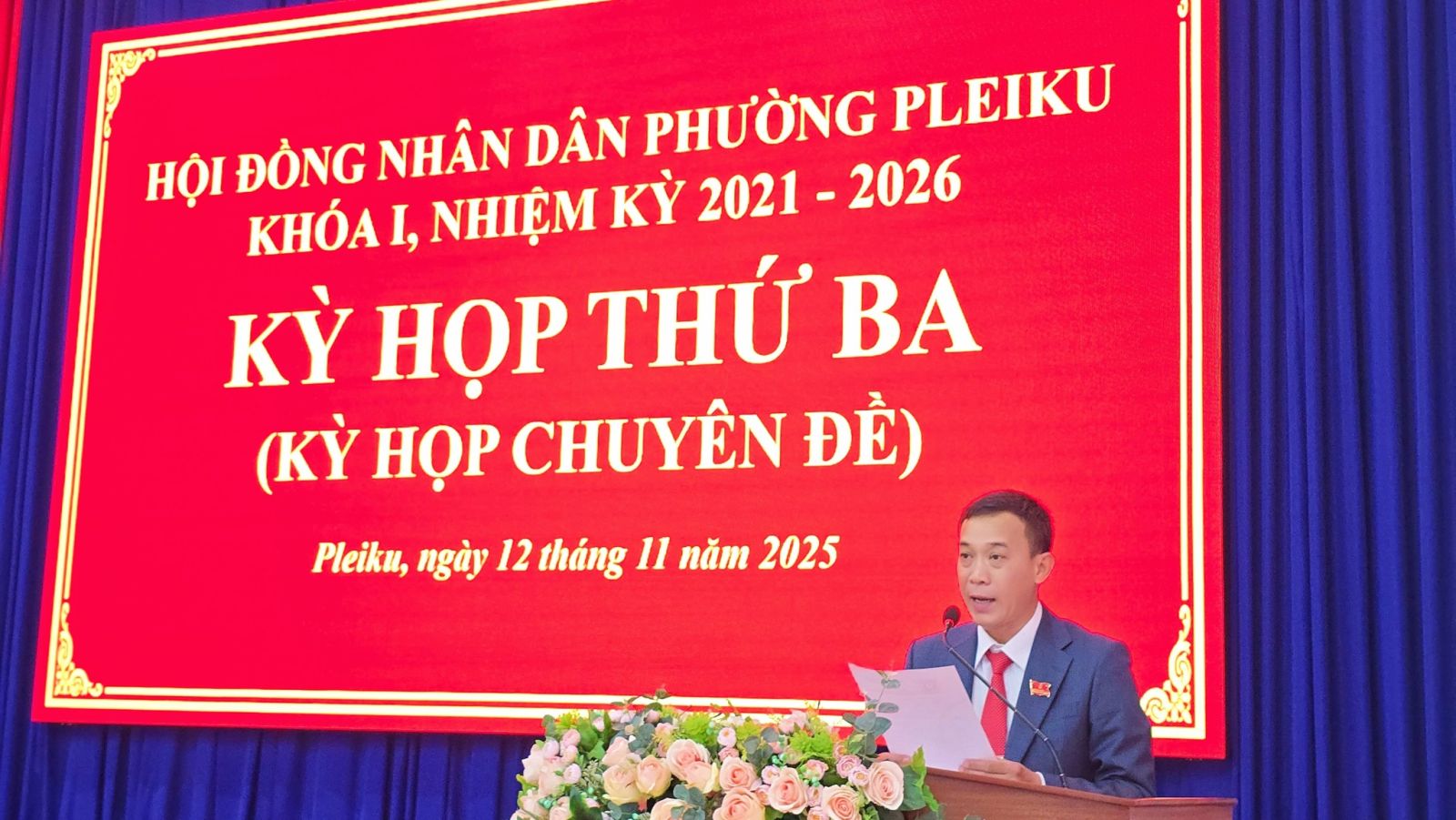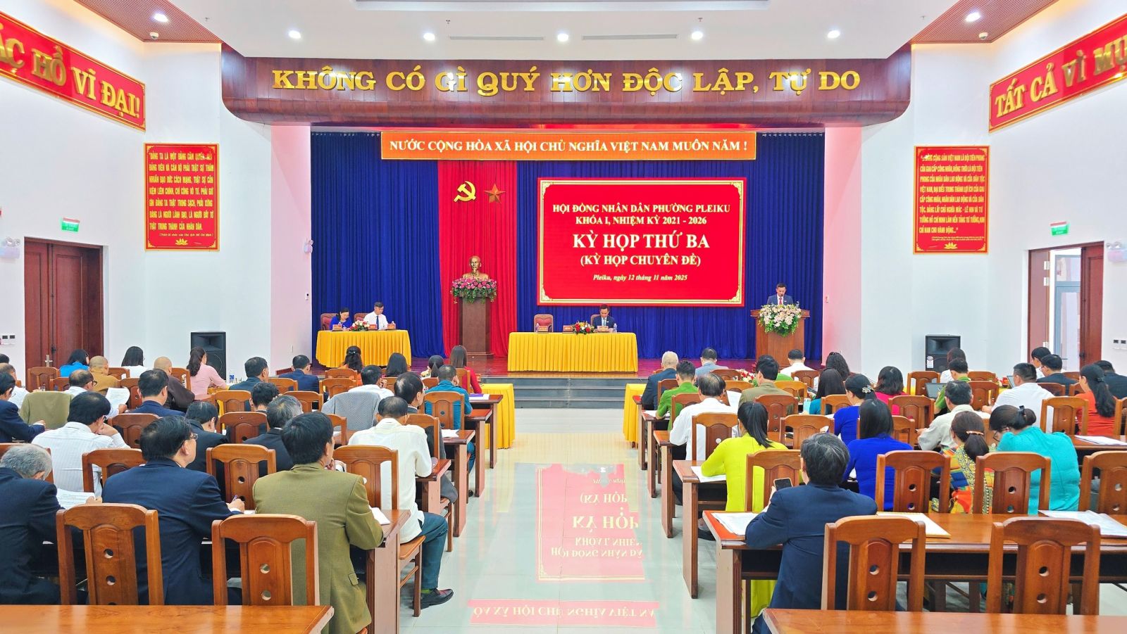 Chiều 12-11, HĐND phường Pleiku khoá I, nhiệm kỳ 2021-2026 tổ chức kỳ họp thứ Ba (chuyên đề) để xem xét, quyết định một số nội dung thuộc thẩm quyền. Các ông: Nguyễn Xuân Phước- Tỉnh uỷ viên, Bí thư Đảng uỷ, Chủ tịch HĐND phường, Trần Văn Phúc- Phó Chủ tịch Thường trực HĐND phường Pleiku chủ trì kỳ họp.