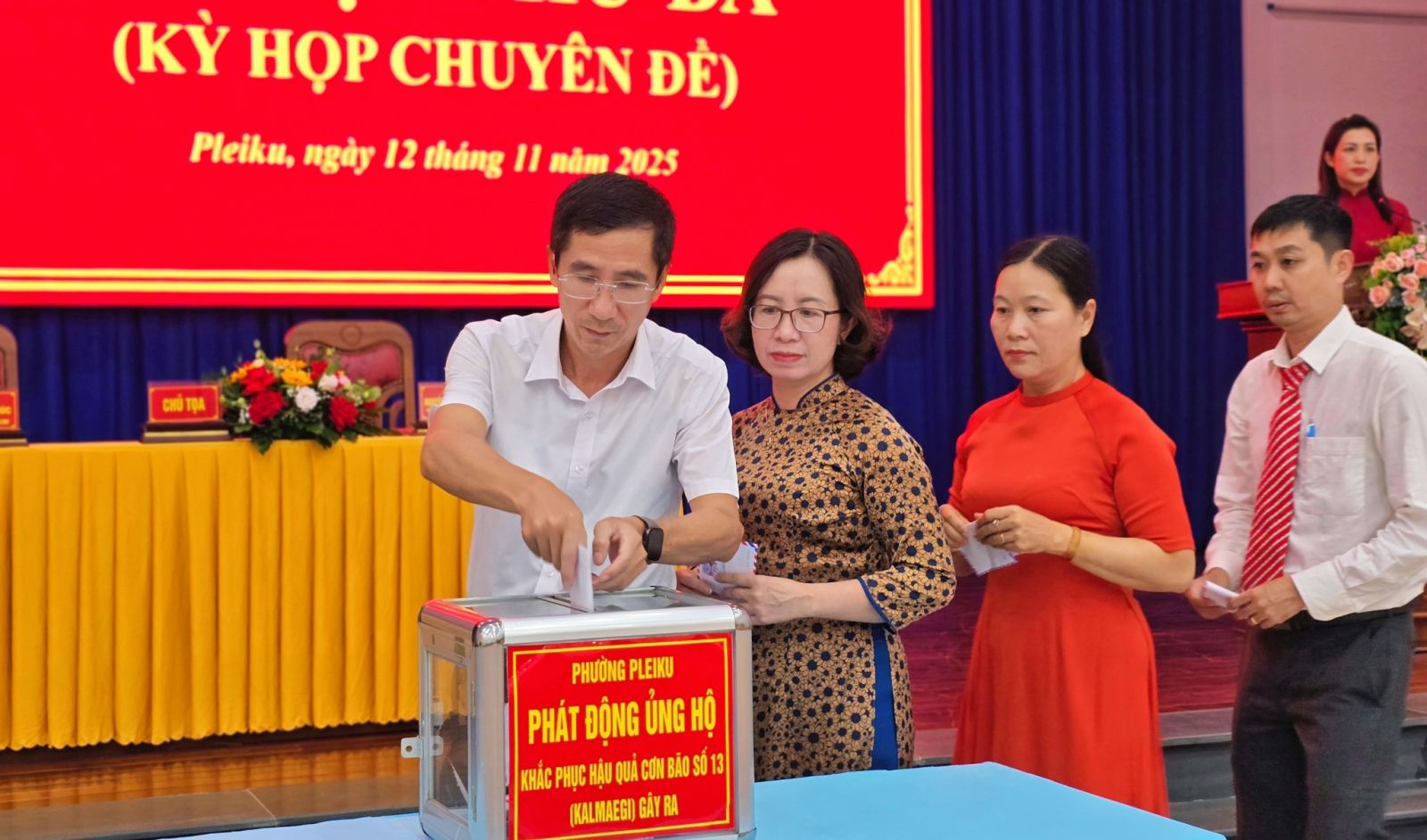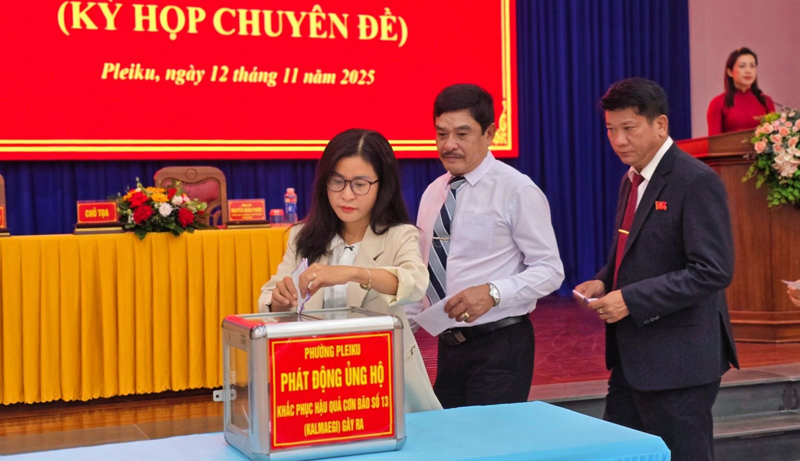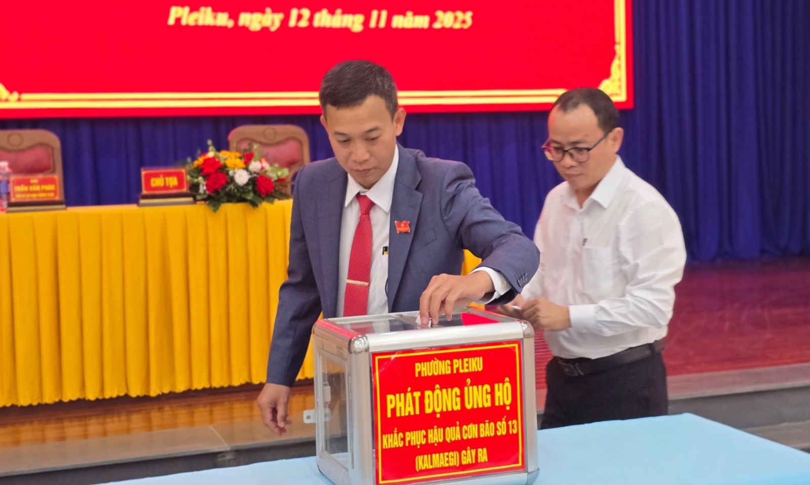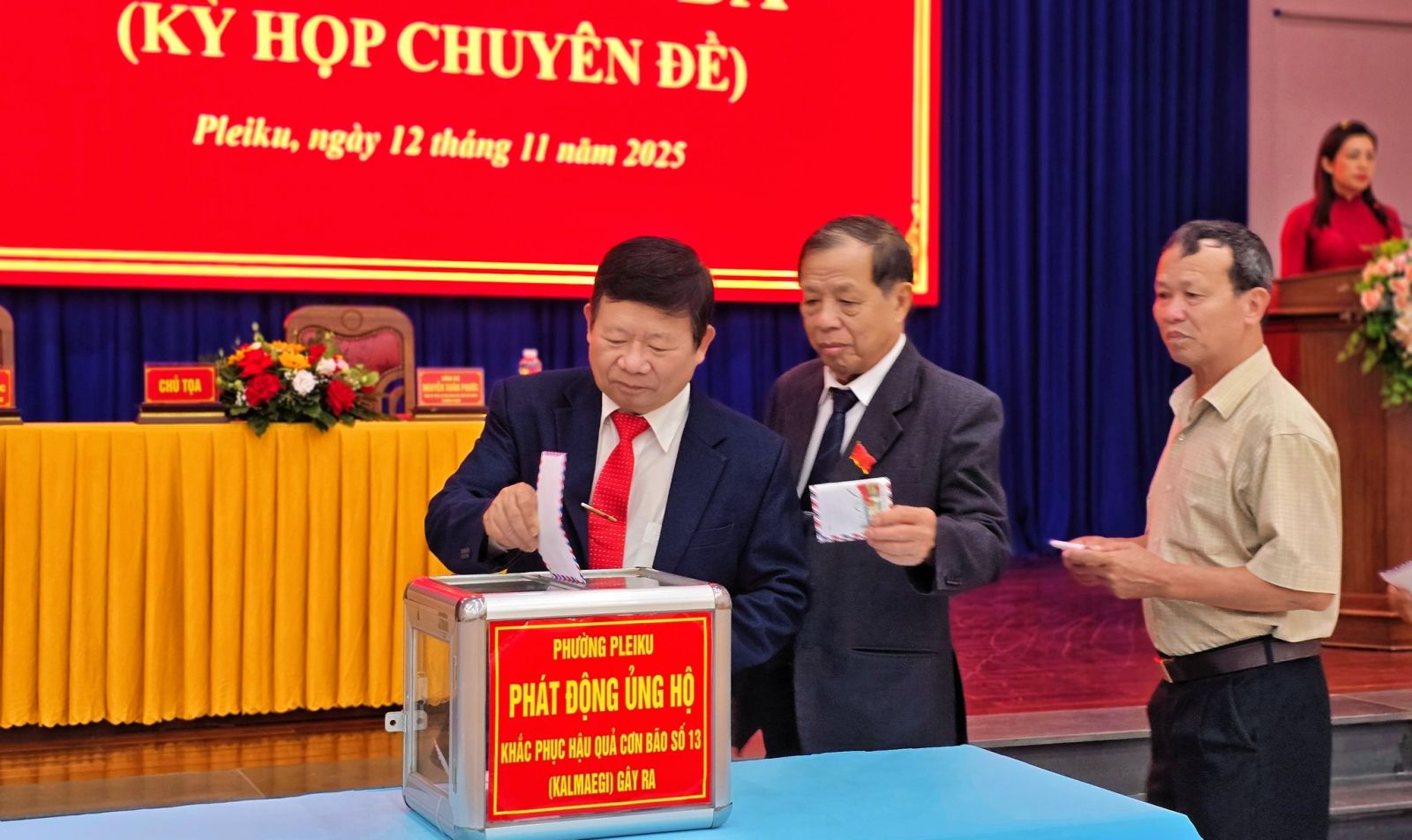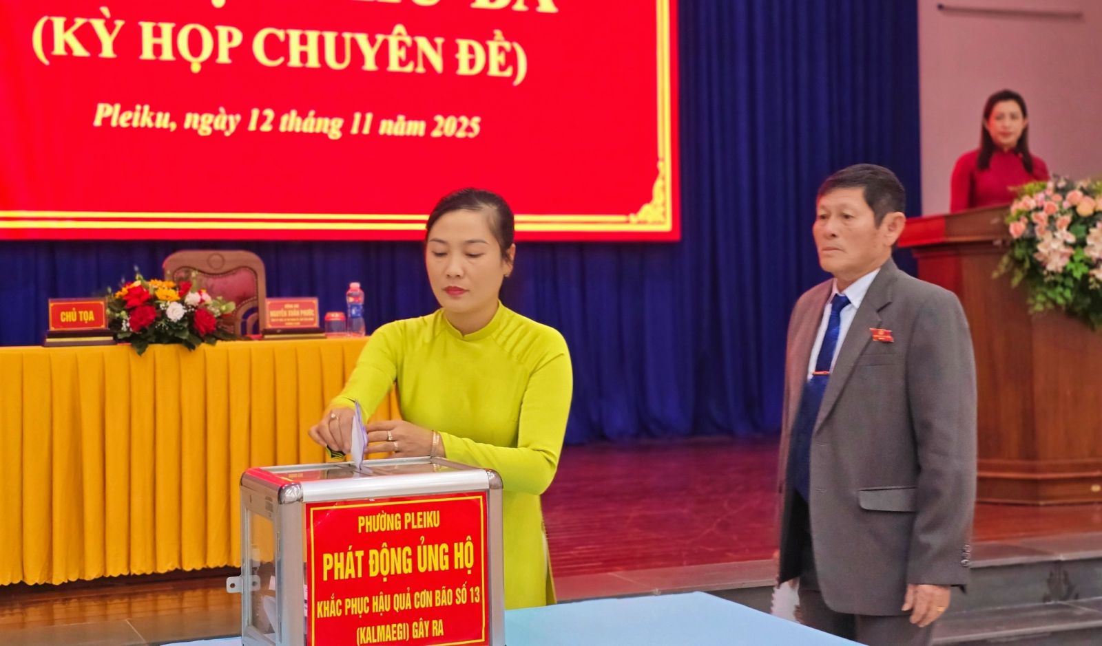 Nhằm kịp thời sẻ chia khó khăn với nhân dân các địa phương bị ảnh hưởng bởi cơn bão số 13 (Kalmaegi). Chiều 12-11, trước khi diễn ra Kỳ họp thứ Ba (chuyên đề) HĐND phường Pleiku khóa I, nhiệm kỳ 2021-2026, Ủy ban MTTQ Việt Nam phường Pleiku đã phát động quyên góp, ủng hộ đồng bào vùng bão. Theo đó, những ngày vừa qua, cơn bão số 13 với cường độ mạnh và sức tàn phá lớn của cơn bão đã gây ra thiệt hại lớn cho tỉnh Gia Lai với tổng thiệt hại kinh tế ước tính hơn 5.200 tỷ đồng. Với tinh thần “nhường cơm sẻ áo”, “một miếng khi đói bằng một gói khi no”, các đại biểu tham dự kỳ họp đã tích cực hưởng ứng, quyên góp được số tiền gần 10 triệu đồng. Toàn bộ số tiền ủng hộ sẽ được chuyển đến Ủy ban MTTQ Việt Nam tỉnh Gia Lai để kịp thời hỗ trợ đồng bào vùng bị thiệt hại.