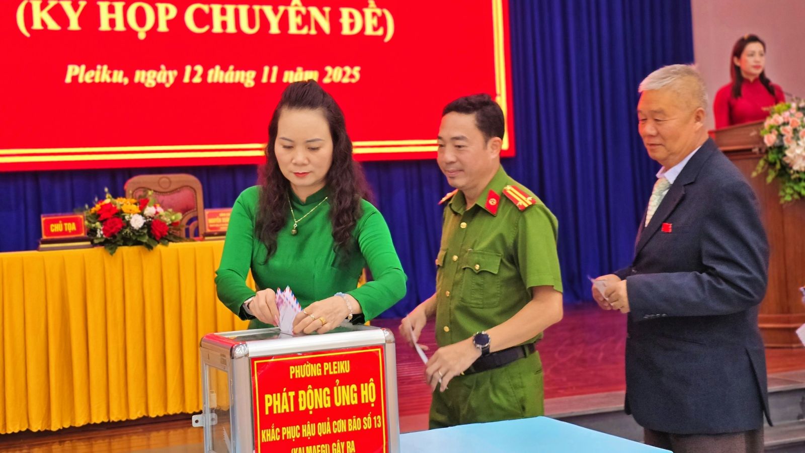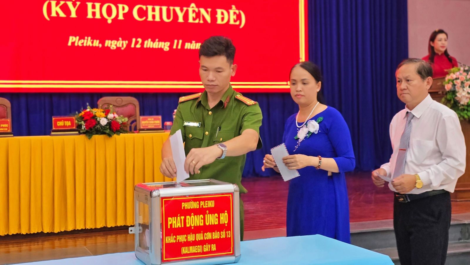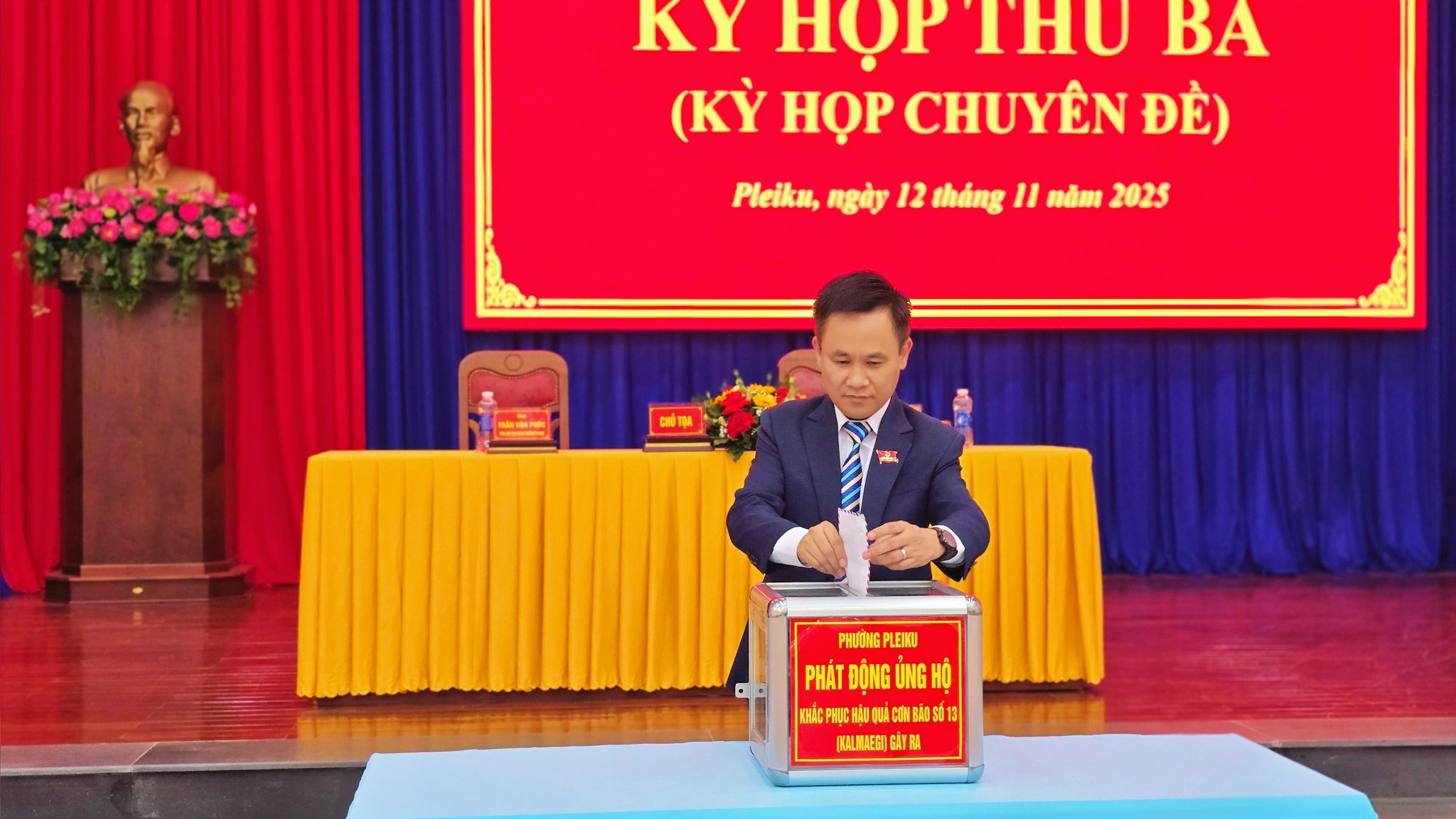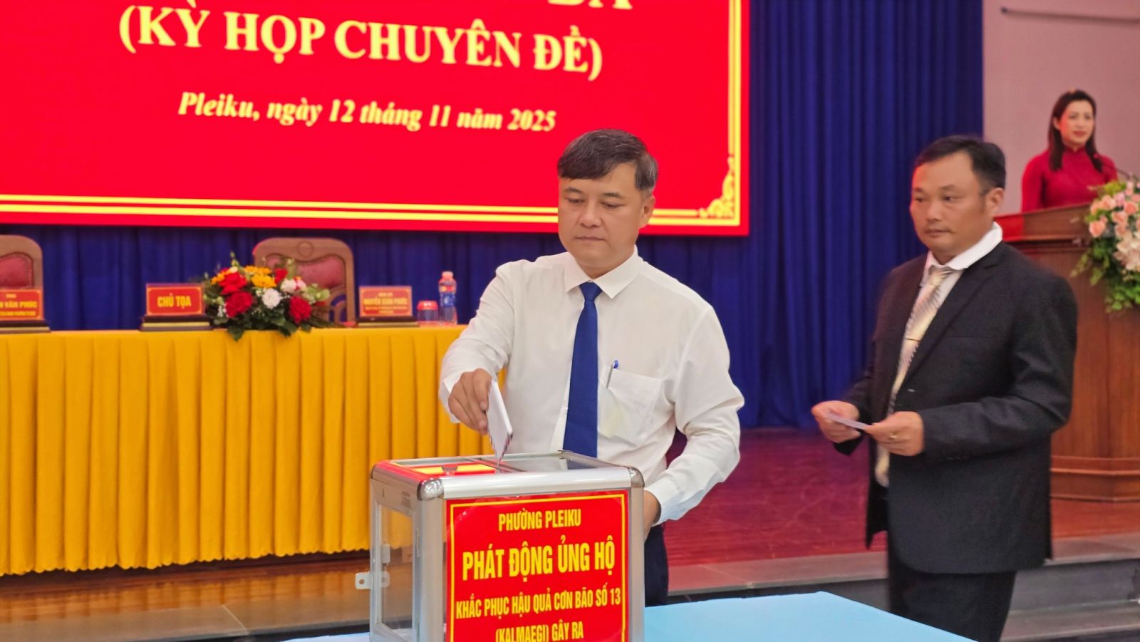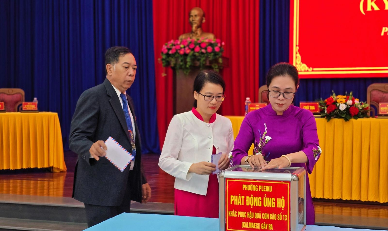 Nhằm kịp thời sẻ chia khó khăn với nhân dân các địa phương bị ảnh hưởng bởi cơn bão số 13 (Kalmaegi). Chiều 12-11, trước khi diễn ra Kỳ họp thứ Ba (chuyên đề) HĐND phường Pleiku khóa I, nhiệm kỳ 2021-2026, Ủy ban MTTQ Việt Nam phường Pleiku đã phát động quyên góp, ủng hộ đồng bào vùng bão. Theo đó, những ngày vừa qua, cơn bão số 13 với cường độ mạnh và sức tàn phá lớn của cơn bão đã gây ra thiệt hại lớn cho tỉnh Gia Lai với tổng thiệt hại kinh tế ước tính hơn 5.200 tỷ đồng. Với tinh thần “nhường cơm sẻ áo”, “một miếng khi đói bằng một gói khi no”, các đại biểu tham dự kỳ họp đã tích cực hưởng ứng, quyên góp được số tiền gần 10 triệu đồng. Toàn bộ số tiền ủng hộ sẽ được chuyển đến Ủy ban MTTQ Việt Nam tỉnh Gia Lai để kịp thời hỗ trợ đồng bào vùng bị thiệt hại.