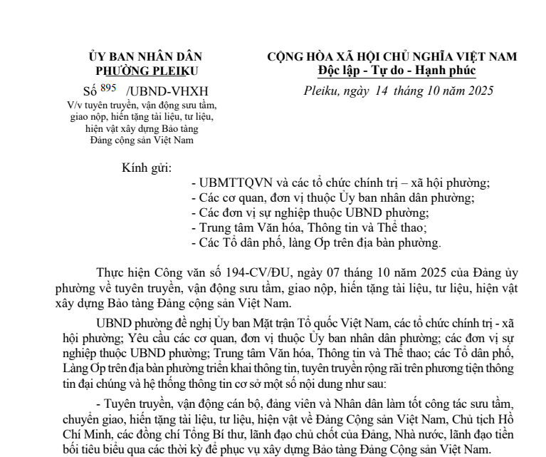 Thực hiện theo Công văn số 194-CV/ĐU của Đảng ủy phường, Ủy ban nhân dân (UBND) phường Pleiku đã ra văn bản số 895/UBND-VHXH về việc tuyên truyền và vận động sưu tầm, giao nộp và hiến tặng các tài liệu, tư liệu và hiện vật nhằm phục vụ công tác xây dựng Bảo tàng Đảng Cộng sản Việt Nam.