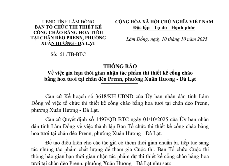 Ban Tổ chức Cuộc thi thiết kế cổng chào bằng hoa tươi tại chân đèo Prenn, phường Xuân Hương - Đà Lạt đã ra thông báo về việc gia hạn thời gian nhận tác phẩm dự thi.