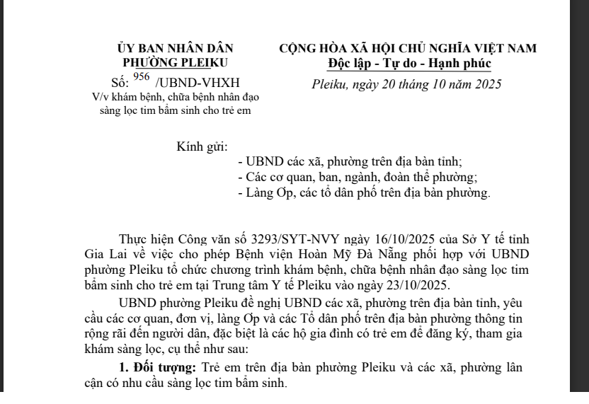 Thực hiện Công văn số 3293/SYT-NVY ngày 16/10/2025 của Sở Y tế tỉnh Gia Lai , Ủy ban nhân dân (UBND) phường Pleiku thông báo về việc phối hợp với Bệnh viện Hoàn Mỹ Đà Nẵng tổ chức chương trình khám bệnh, chữa bệnh nhân đạo sàng lọc tim bẩm sinh cho trẻ em.